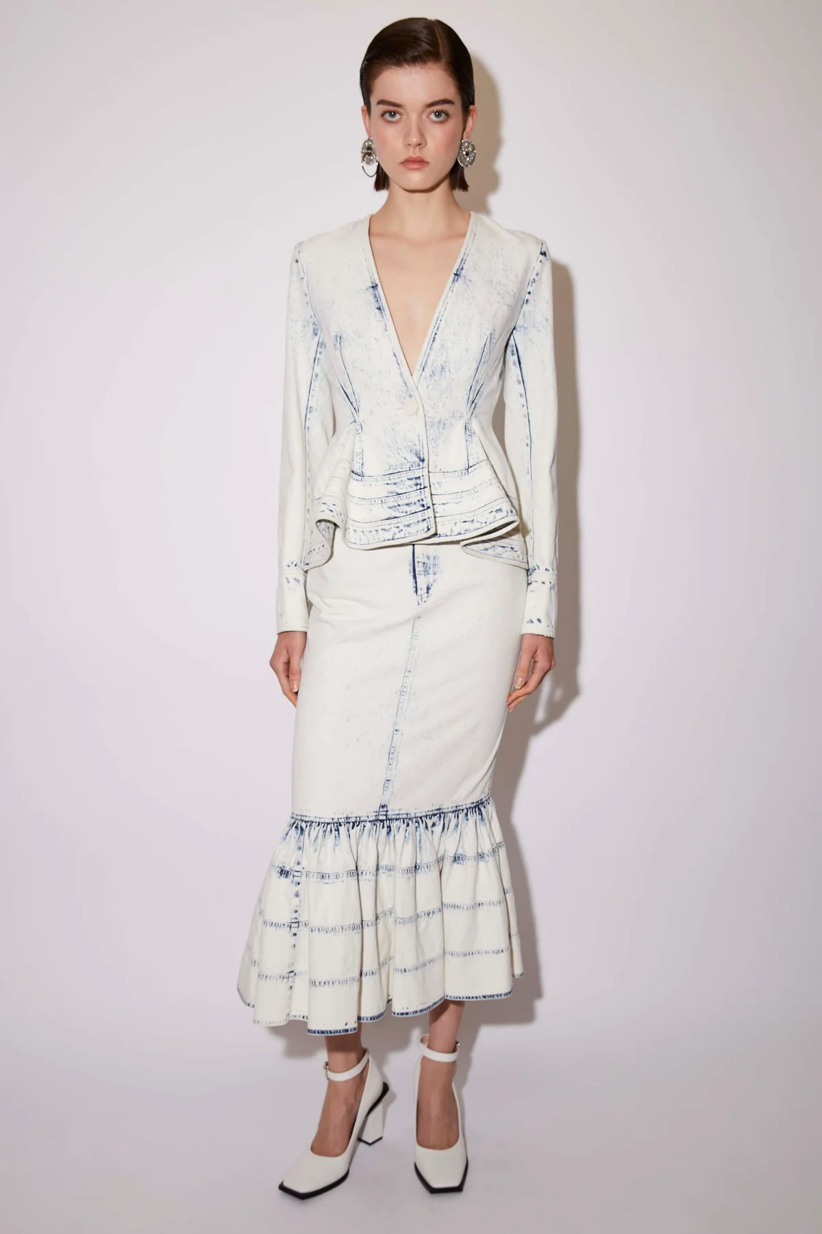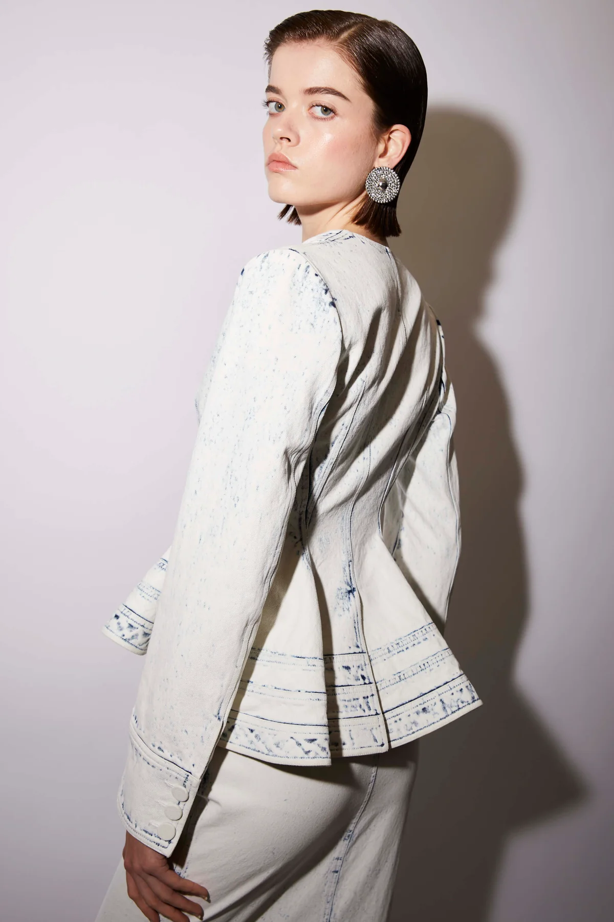 The Igone is a V-neck jacket tailored from lightweight denim in a bleach effect achieved with laser washing. The Igone has a slim fit body, single button closure and a peplum hem.