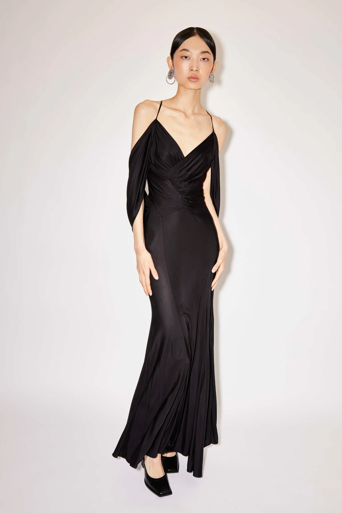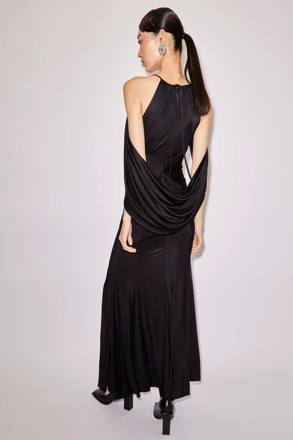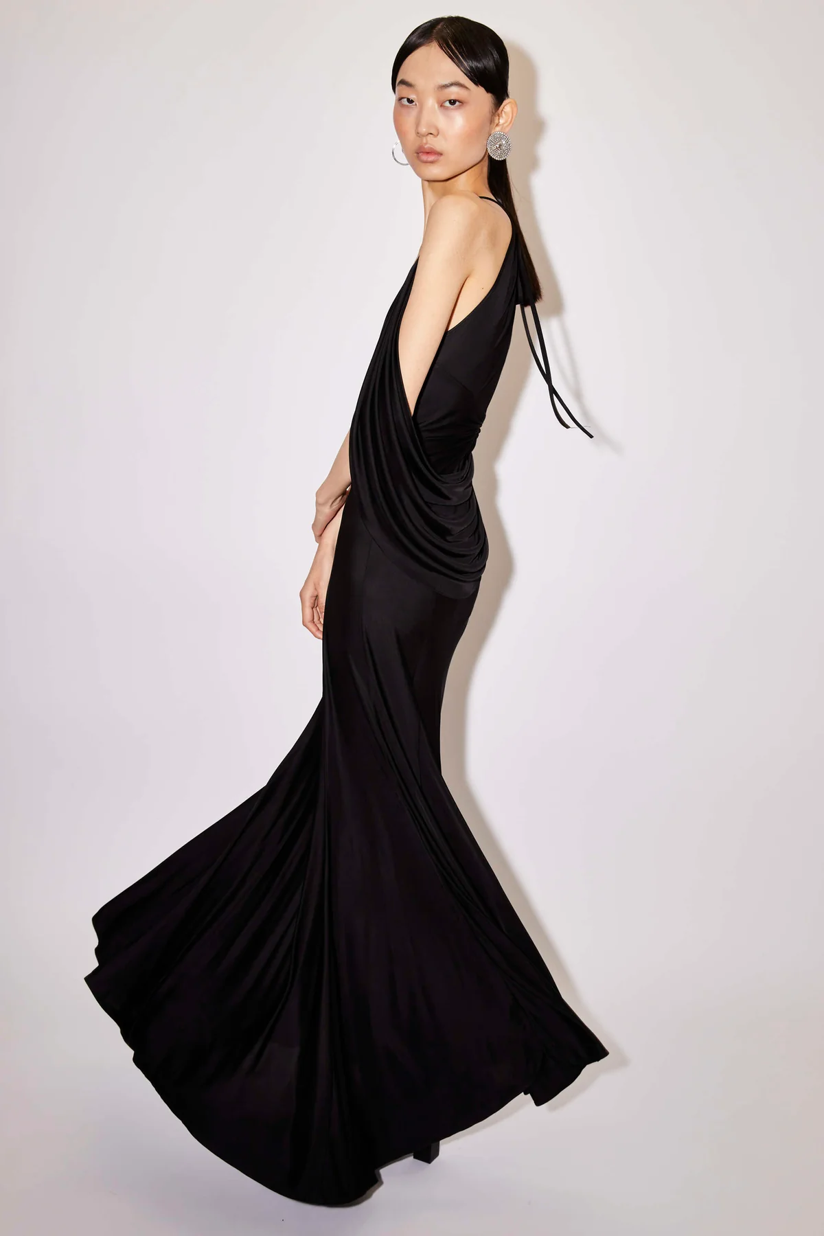 The Bernice is an ankle length dress made from super soft Italian satin jersey. The Bernice features an exposed shoulder with the fabric cascading and draping across the upper arms and the back. Features a concealed zip through centre back.