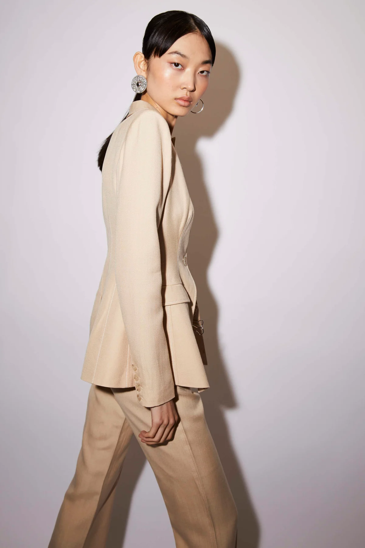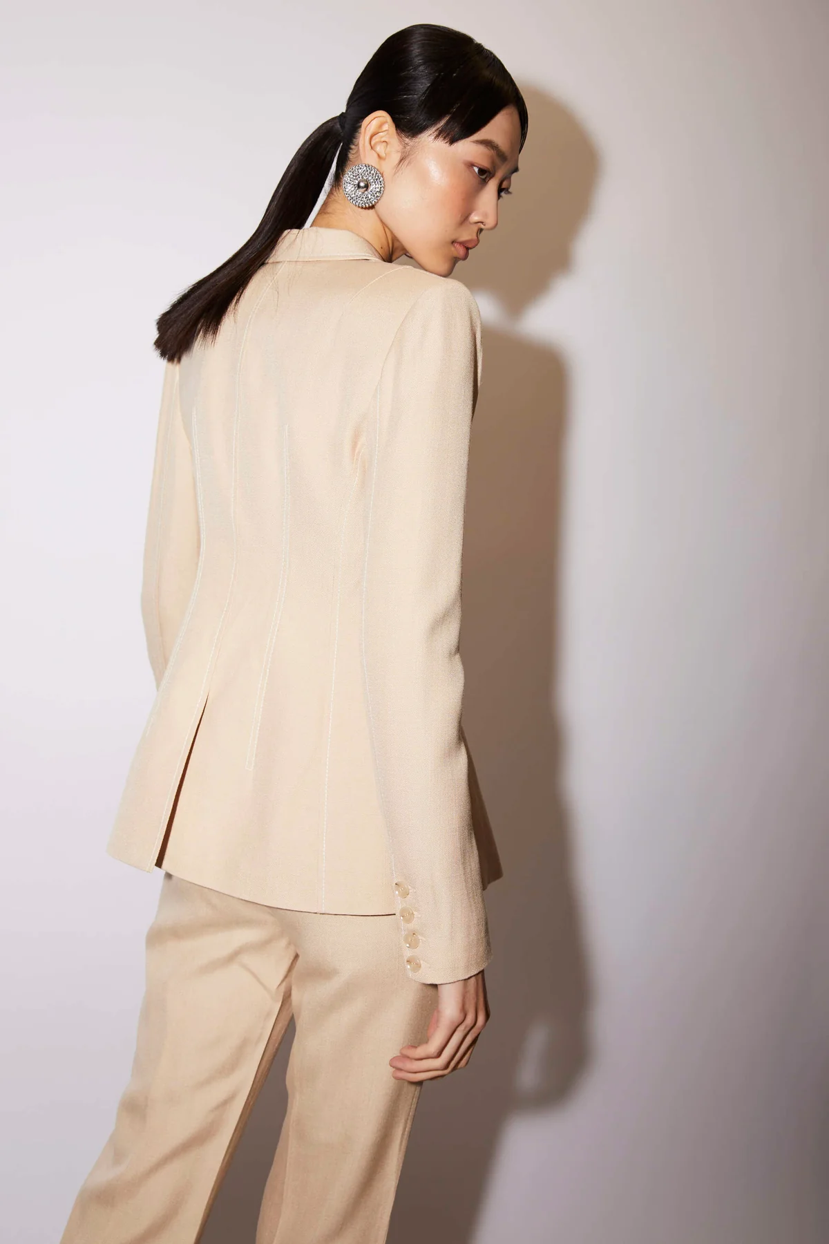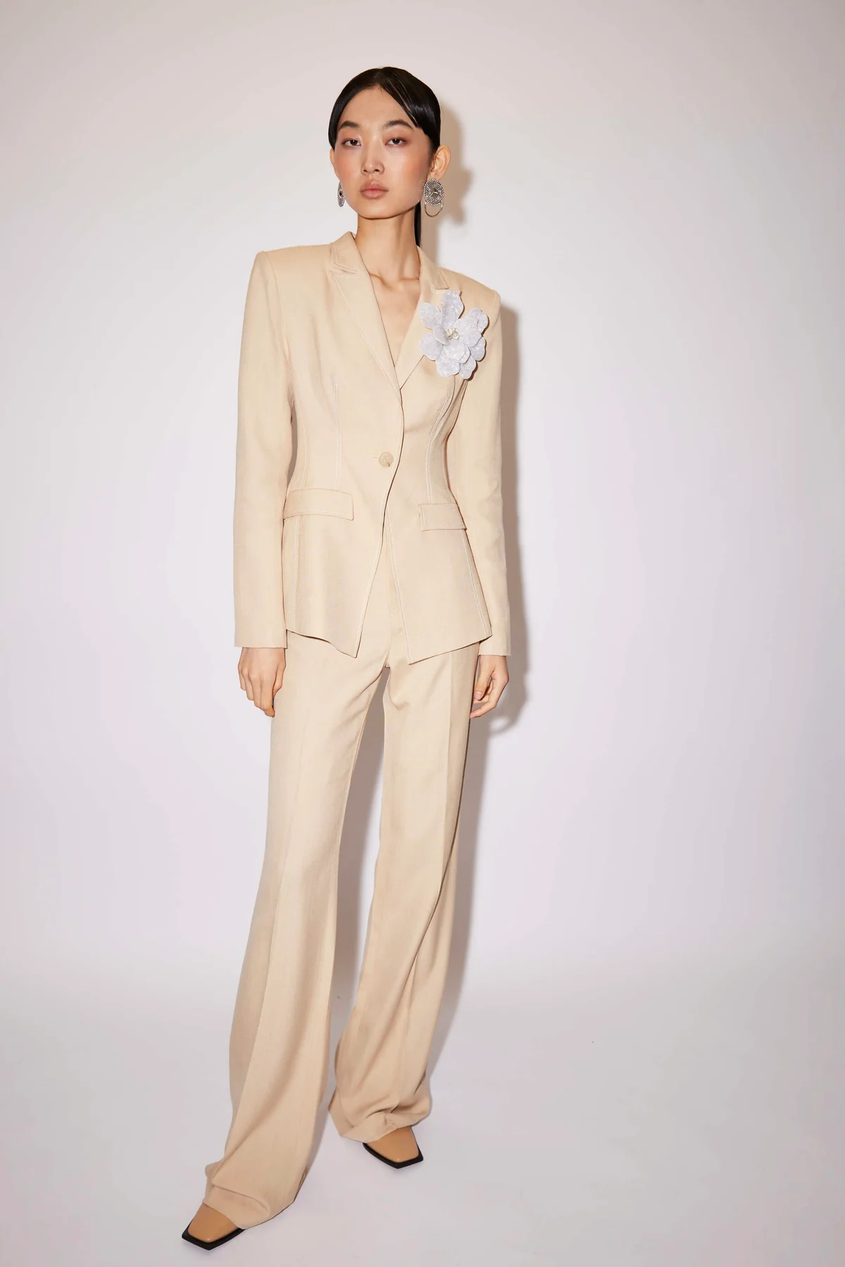 The Darcey is a longline bootcut trouser tailored from Italian Eco Vero textured viscose. The Darcey has a cutaway waistband, belt loops, a concealed zip closure and features white contrast stitching. Lined with silk.