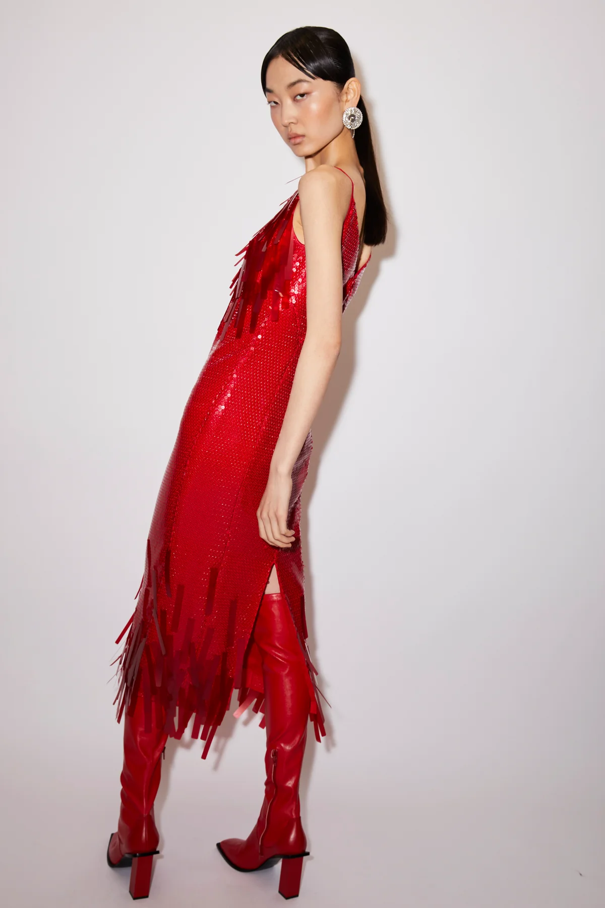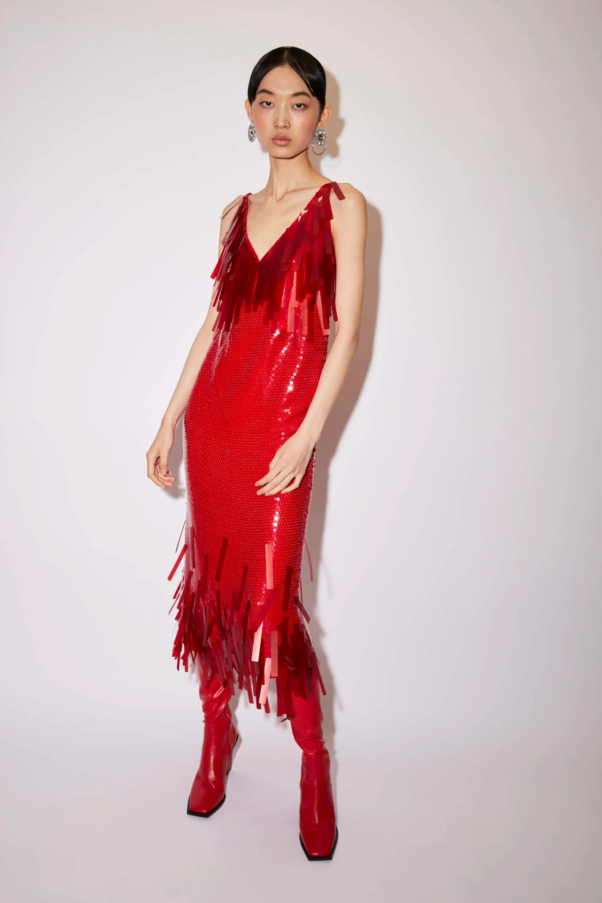 The Ludmila is a relaxed midi-dress embroidered with all-over transparent sequins with suspended beading on the neck and hem for movement. Lined with silk.
