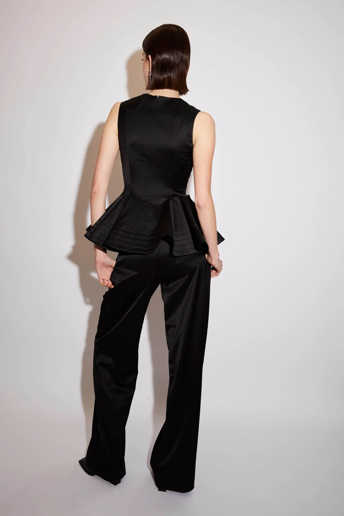 The Petra top is crafted from shiny Satin. The Petra has a dramatic peplum wave hem. Features a concealed back zip. Lined with silk.