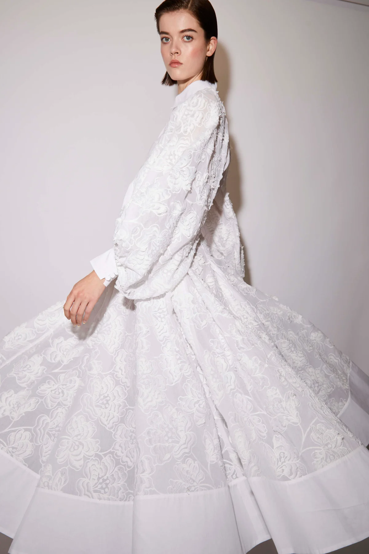 The Rowena is a full skirt in lightweight cotton organdie, heavily embroidered for a floral motif, framed with a large, solid band at the hem. Features a concealed zip through centre back.